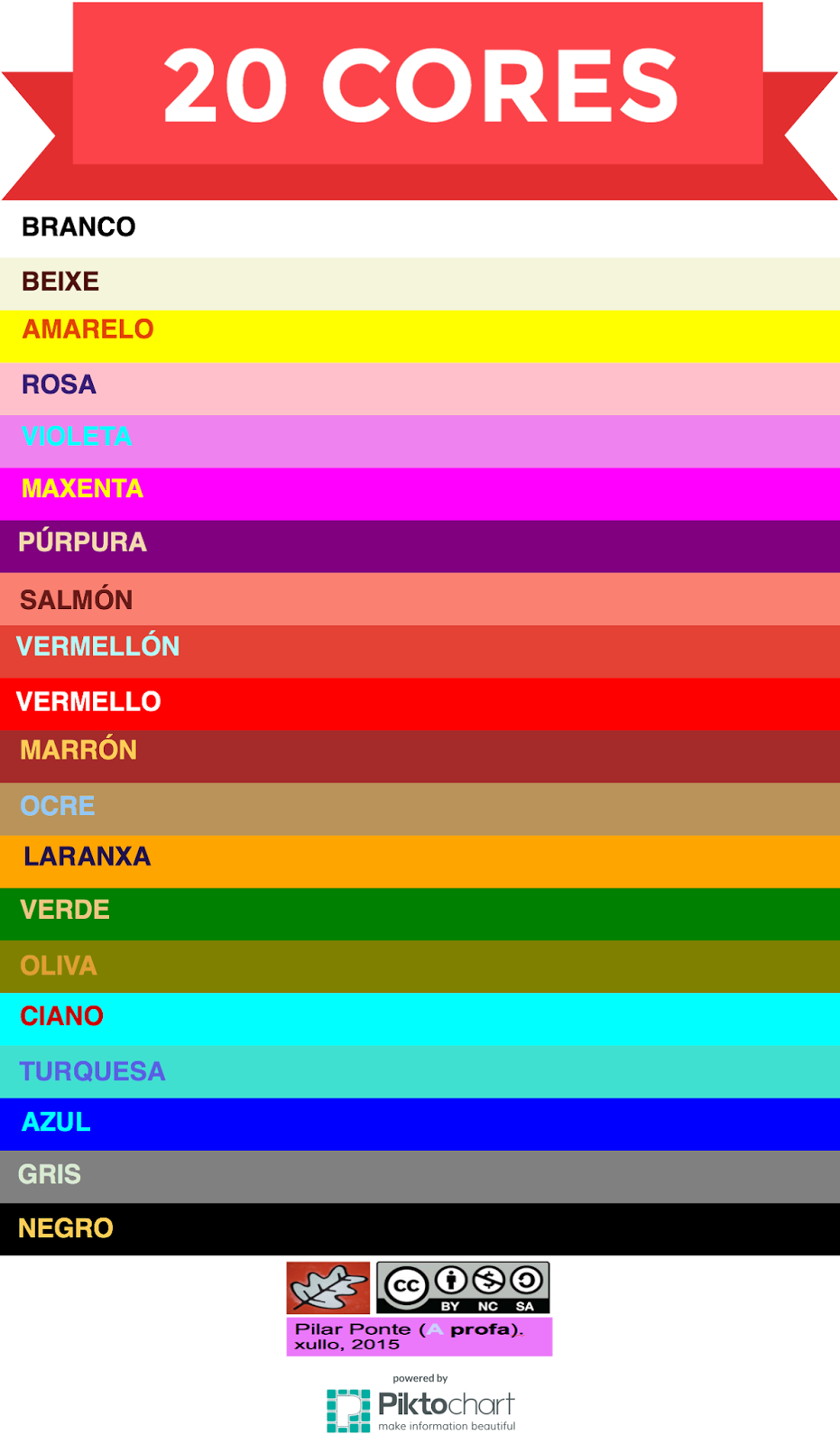 - E ti cantas cores coñeces? Se premes aquí poderás ver unha listaxe de 20 cores diferentes co seu nome.