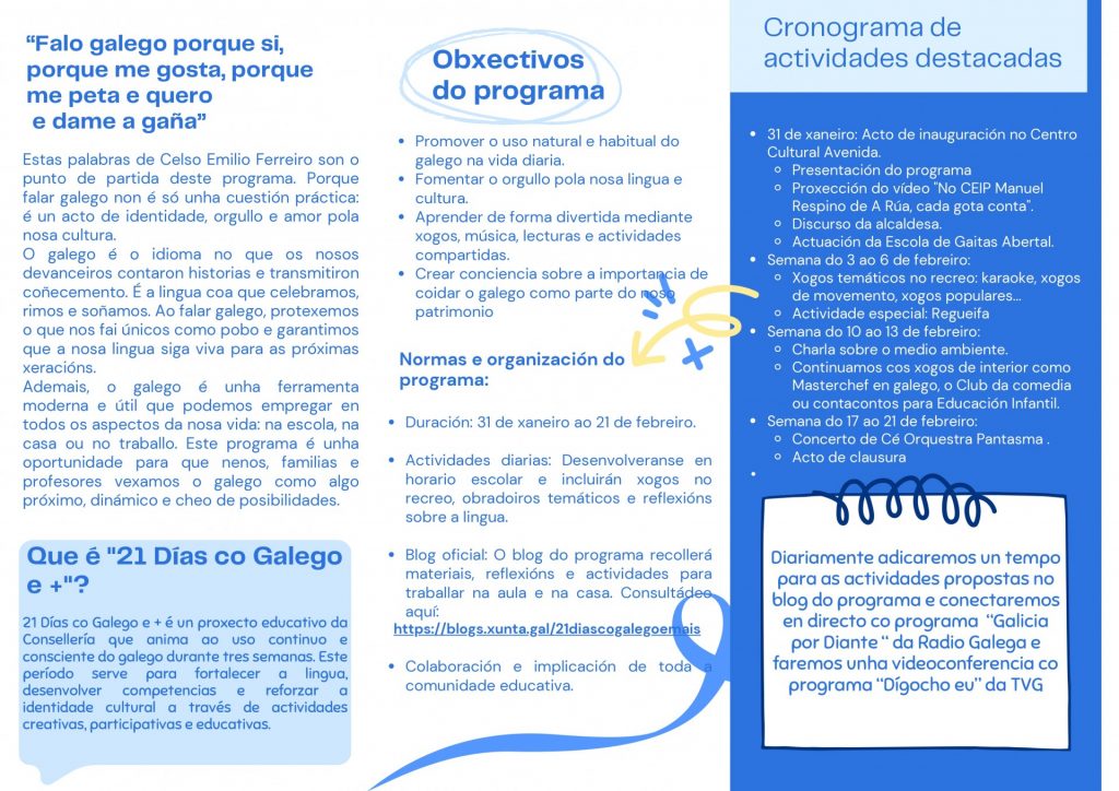 Para saberdes ben como se vai desenvolver o programa 21 Días co galego e + traémosvos como exemplo un tríptico informativo ben xeitoso creado para informar as familias polo CEIP Manuel Respino da Rúa de Valdeorras en Ourense.