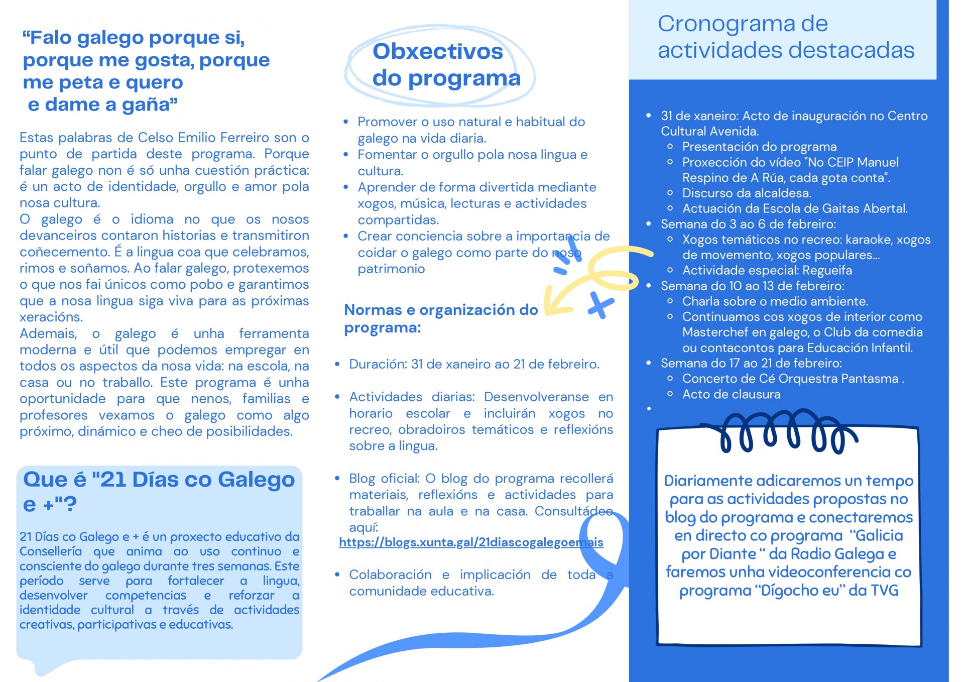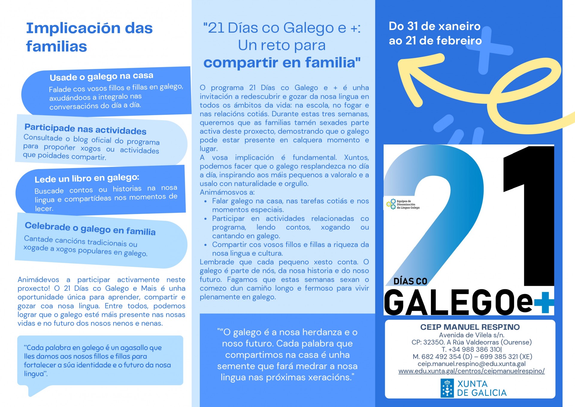 Para saberdes ben como se vai desenvolver o programa 21 Días co galego e + traémosvos como exemplo un tríptico informativo ben xeitoso creado para informar as familias polo CEIP Manuel Respino da Rúa de Valdeorras en Ourense.