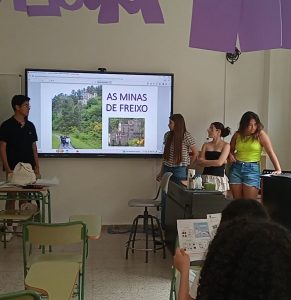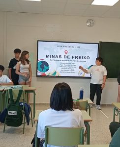 En xuño os alumnos/as realizaron unha última actividade relacionada con este Proxecta que os converteu en relatores, ao explicar aos seus compañeiros/as de 1º, 2º, 4º ESO e profesorado o que aprenderon durante este curso sobre a Ribeira Sacra e as minas de Freixo. Divididos en grupos, foron explicando clase por clase distintos aspectos do seu traballo: comezaron explicando desde cando a Ribeira Sacra é BIC e por que retirou a súa candidatura en xuño de 2021 para ser nomeada Patrimonio da Humanidade; continuaron localizando xeográficamente as minas de Freixo e explicaron importantes datos sobre elas: orixe xeolóxica do xacemento, historia das minas, problemas para transportar o mineral, construción do funicular, destino da produción, quen era Federico Guillermo Cloos, etc.