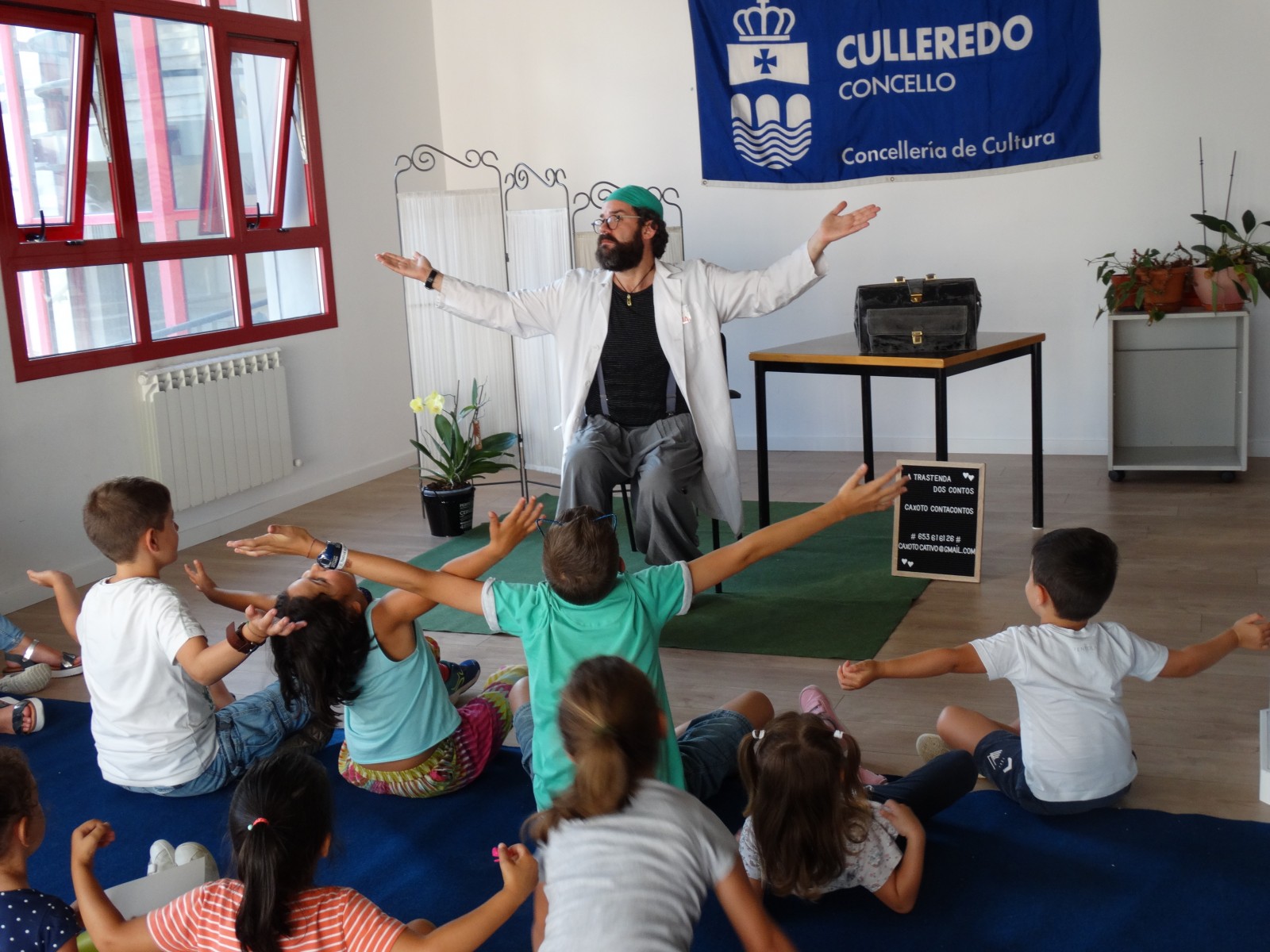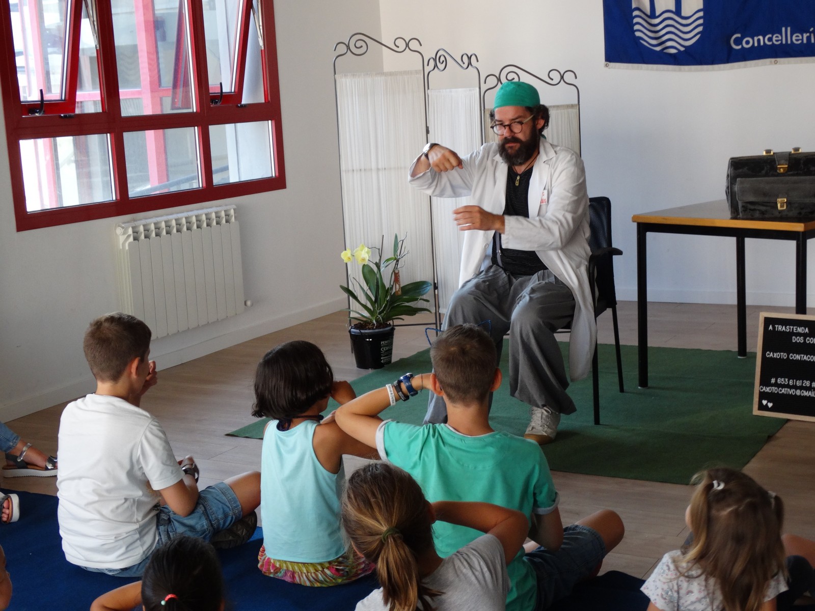 O Dr. Tilla contoulle aos nenos o conto de Laura que quería ser pirata, para explicarlles como acabar coa enfermidade do machismo. Os pais, nais e rapazada interactuaron e riron moito cao posta en escea que fixo Caxoto.