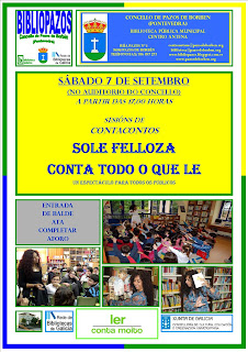O próximo sábado día 7 de setembro a partir das 17,00 horas (5 da tarde), no Auditorio do Concello, teremos unha actuación especial de narración oral coa actriz, contacontos, dramaturga e fotógrafa SOLEDAD FELLOZA que nos traerá o espectáculo “Sole Felloza conta todo o que le”.